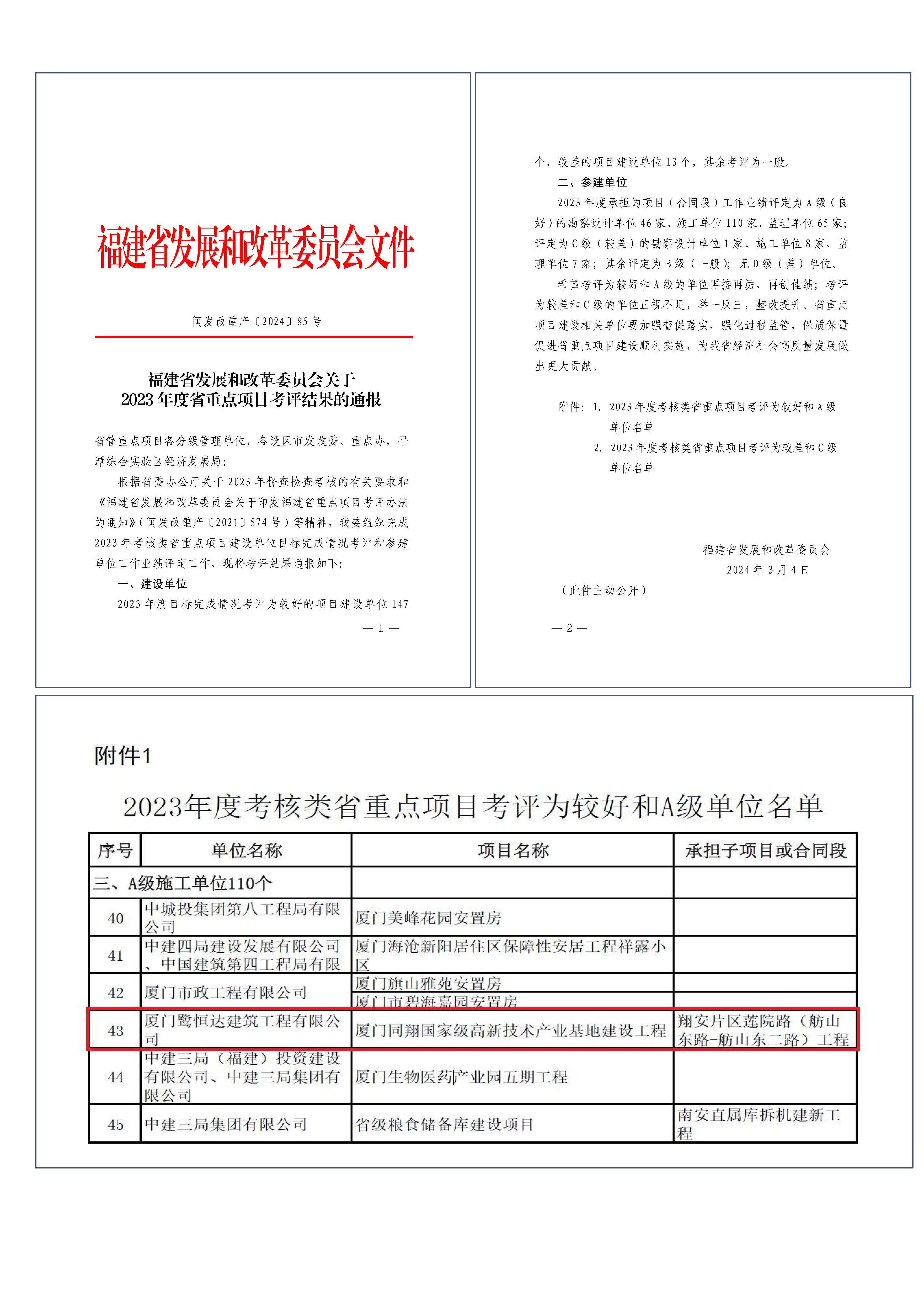 近日,福建省发展和改革委员会关于2023年度省重点项目考评结果的通报(闽发改重产〔2024〕85号),kaiyun(中国)一站式服务平台承建项目同翔高新技术产业基地翔安片区莲院路(舫山东路-舫山东二路)工程获评2023年度省重点项目A级施工单位。
